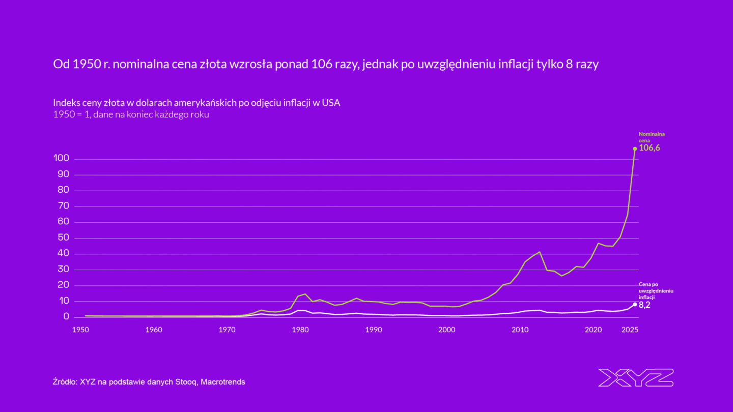Wysoki popyt na złoto to efekt tego, że historycznie ten metal nie traci na wartości. Nie oznacza to jednak, że zawsze zyskuje. Widać to na wykresie. Od 1950 r. do końca 2025 r. nominalna cena, wyrażona w dolarach, wzrosła ponad 106 razy. Bez wątpienia jest to imponujący wzrost.