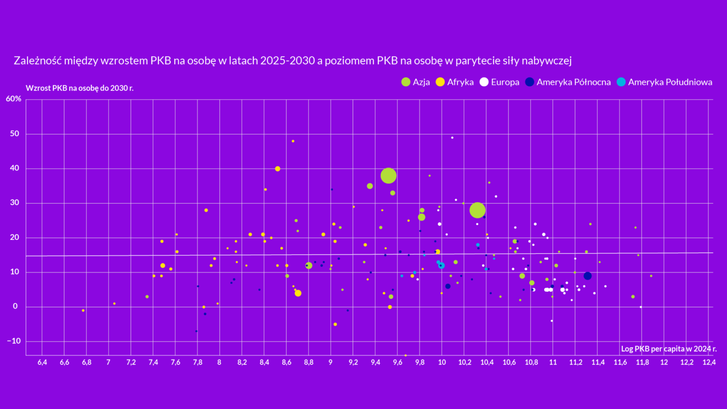 Powyższy wykres obrazuje zależność (a właściwie jej brak) między poziomem dochodu na osobę w 2024 r. a skumulowanym wzrostem PKB w latach 2025-2030. Nie mamy tu więc do czynienia ani z jednoznaczną konwergencją, ani dywergencją. Wykres należy traktować ilustracyjnie – oparty jest na prognozie MFW, która może się nie sprawdzić, a sam horyzont czasowy jest relatywnie krótki.