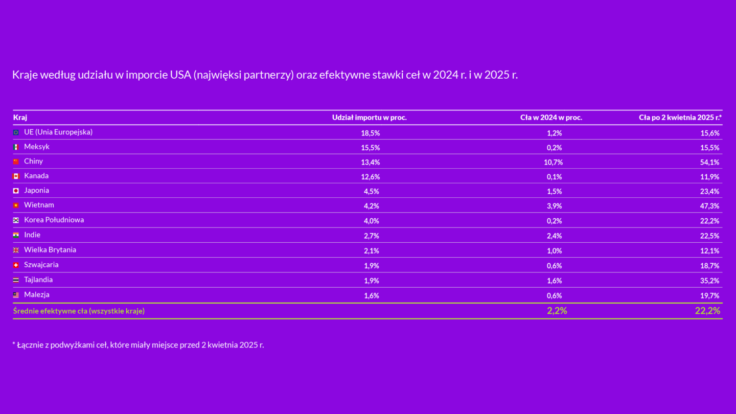 W 2024 r. przeciętne cła w USA wynosiły 2,3 proc. Analitycy bankowi spodziewali się ich wzrostu po wygranej Donalda Trumpa do ok. 7,5 proc. Zgodnie z obliczeniami banku federalnego z Richmond po „dniu wyzwolenia” i biorąc pod uwagę także wcześniejsze podwyżki, miały wzrosnąć aż do 22,2 proc.