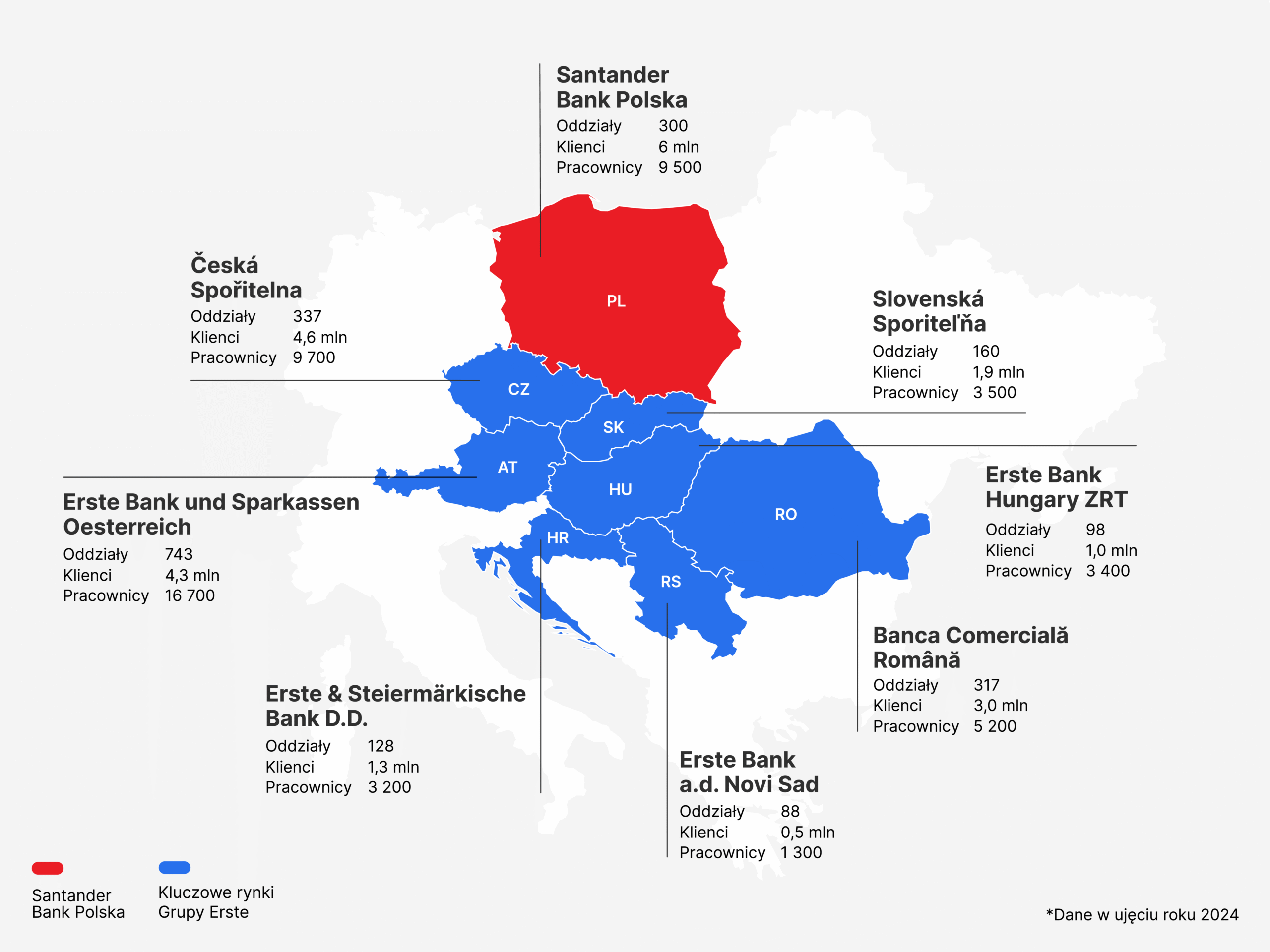 Dziś Erste obsługuje ponad 17 mln klientów. Znajduje się w czołowej trójce instytucji finansowych na większości ze swoich siedmiu kluczowych rynków. Grupa zatrudnia blisko 46 tys. osób i prowadzi 1840 oddziałów, łącząc indywidualne doradztwo z nowoczesnymi technologiami cyfrowymi.