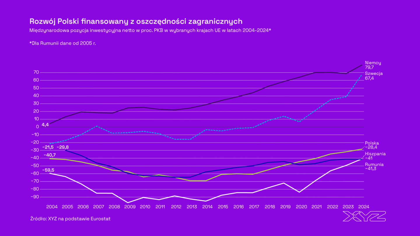- Niedobór krajowego kapitału. Polska przez lata rozwijała się, finansując inwestycje zagraniczne. Międzynarodowa pozycja inwestycyjna netto (NIIP) na koniec 2024 r. wynosiła -28 proc. PKB, co oznacza, że zobowiązania wobec zagranicy przewyższają aktywa Polaków. W latach 2013-2014 wskaźnik ten sięgał nawet -69 proc., a mimo poprawy Polska wciąż należy do krajów o ujemnym bilansie kapitału.