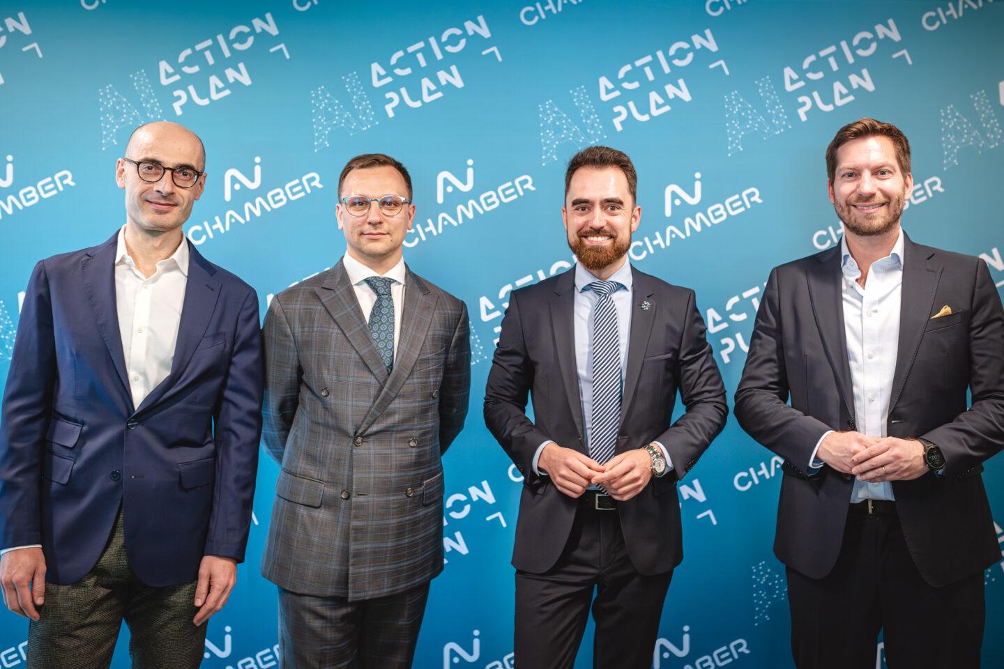 Od lewej: Gabriele Mazzini (MIT Media Lab, współtwórca AI Act), Tomasz Snażyk (prezes AI Chamber), Jan Kavalírek (wiceminister handlu i przemysłu Czech), Mark Boris Andrijanič (EIT, były minister transformacji cyfrowej Słowenii). Fot. Tomek Kaminski