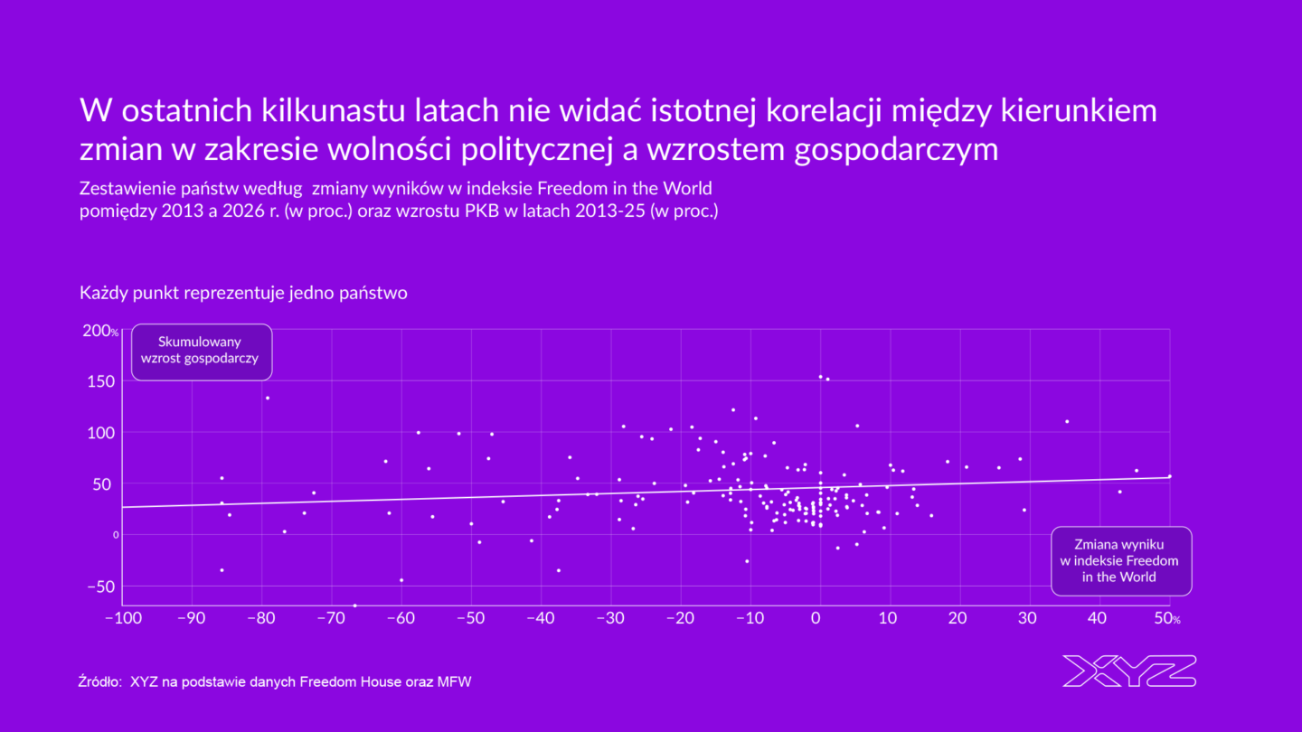 Spójrzmy najpierw na to, jak zmieniały się wyniki państw w tym indeksie w zestawieniu ze stopą wzrostu gospodarczego. Przedstawiłem to na wykresie. Na osi poziomej pokazano procentową zmianę wyniku w indeksie między publikacjami z 2013 i 2026 r. Spadek oznacza pogorszenie sytuacji w zakresie wolności politycznej i praw obywatelskich, a wzrost – poprawę. Na osi pionowej znajduje się skumulowana stopa wzrostu gospodarczego w latach 2013–2025.