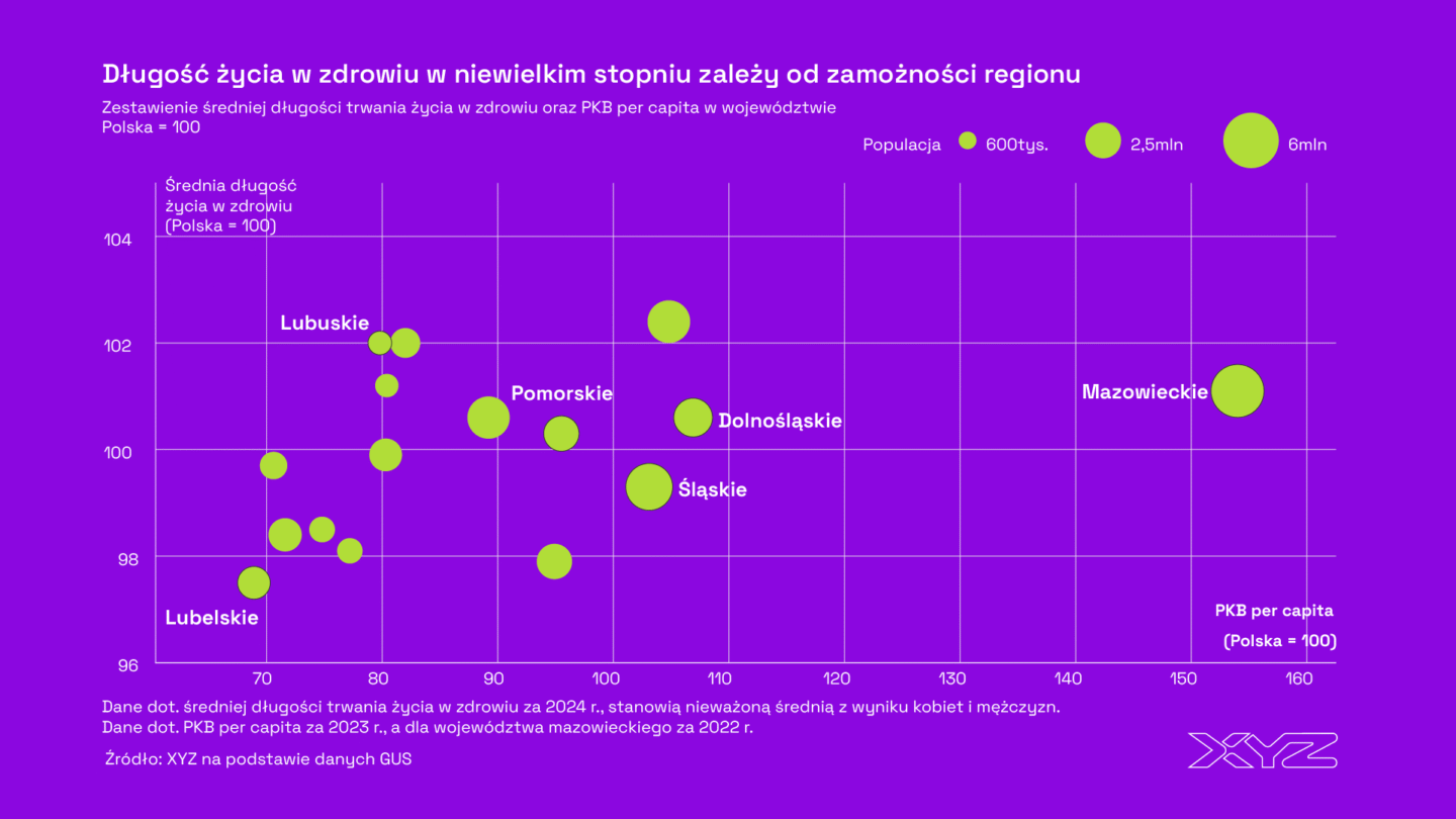 Widać to na wykresie. Województwo lubelskie ma niemal taką samą oczekiwaną długość życia w zdrowiu co województwo łódzkie, choć pierwsze generuje 69 proc. krajowej średniej PKB na mieszkańca, a drugie 95 proc. Z kolei województwa wielkopolskie, dolnośląskie i śląskie generują ok. 105 proc. krajowej średniej po względem dochodu na mieszkańca. Natomiast pod względem oczekiwanej długości trwania życia występują między nimi różnice.