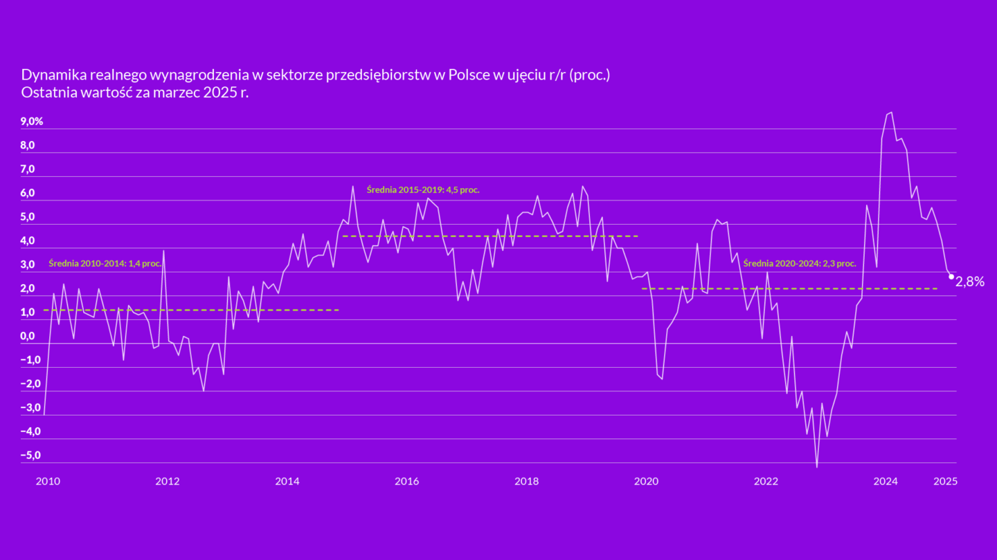 Najważniejszym zjawiskiem, z którym mamy obecnie do czynienia, jest szybki spadek dynamiki płac. To wraz z podwyższoną inflacją, która w pierwszym kwartale wyniosła 4,9 proc. r/r, sprawia, że realna dynamika wynagrodzeń skokowo się obniżyła. W marcu br. wyniosła 2,8 proc., znajdując się w pobliżu średniej dla lat 2020-2024 znajdującej się na poziomie 2,3 proc.