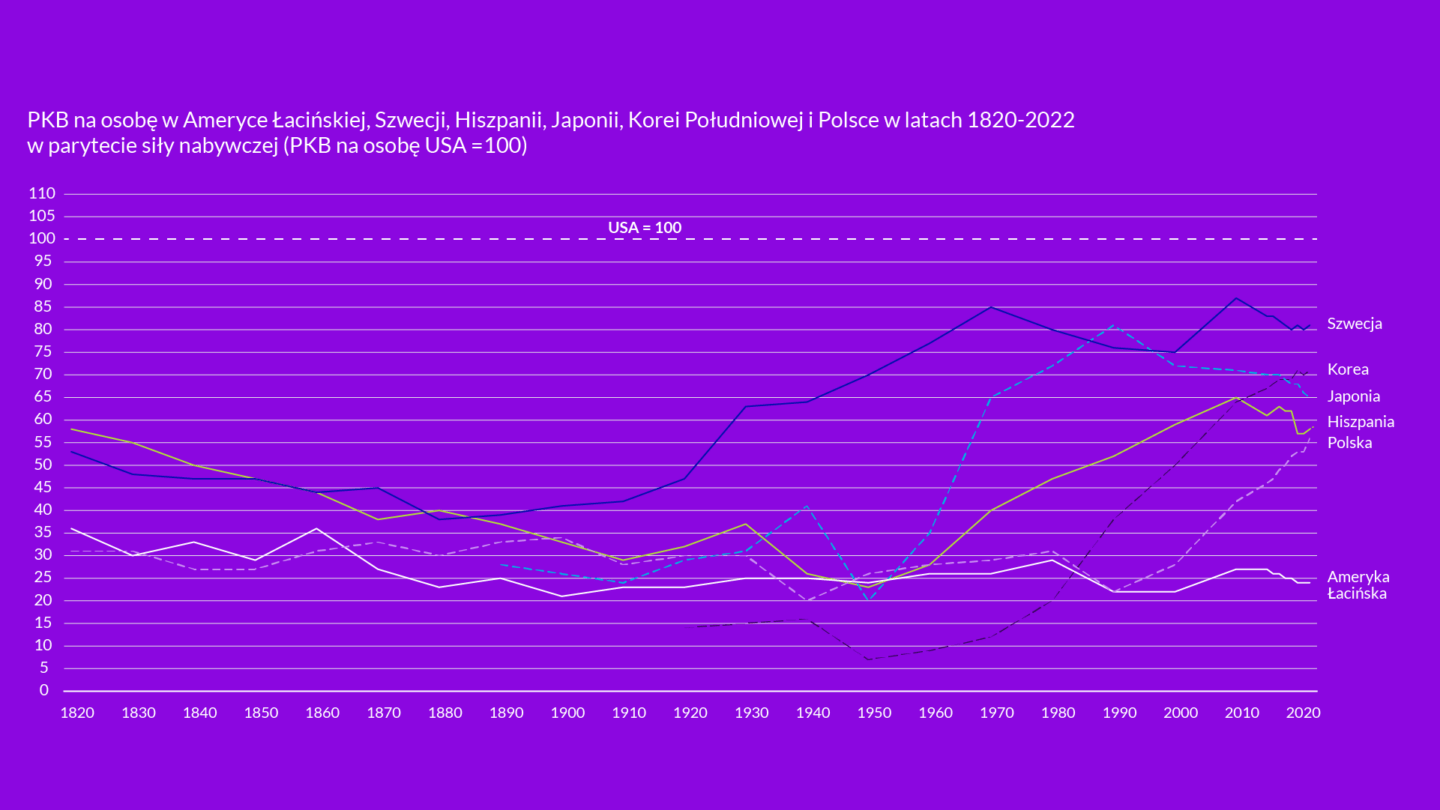 Jeszcze bardziej uderzające jest porównanie z Polską, która swój „start” zaliczyła po transformacji ustrojowej w 1989 r. Od 1820 do 1990 r. trajektorie rozwojowe Polski i Ameryki Łacińskiej przebiegały niemal równolegle. Po 1990 r. Polska dokonała jednak gospodarczego skoku – w 2022 r. osiągnęliśmy 56 proc. dochodu na osobę USA. To najwyższy poziom w dostępnych danych. Ameryka Łacińska nie odnotowała podobnego postępu i pozostała na poziomie ok. 25 proc.
