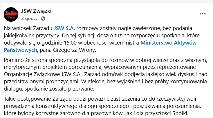 Na profilu Solidarności w JSW podano, że spotkanie rozpoczęło się o godzinie 15 w obecności wiceministra aktywów państwowych Grzegorza Wrony. Pomimo dobrej woli strony społecznej i merytorycznego projektu porozumienia, zarząd przerwał negocjacje bez podania przyczyn.