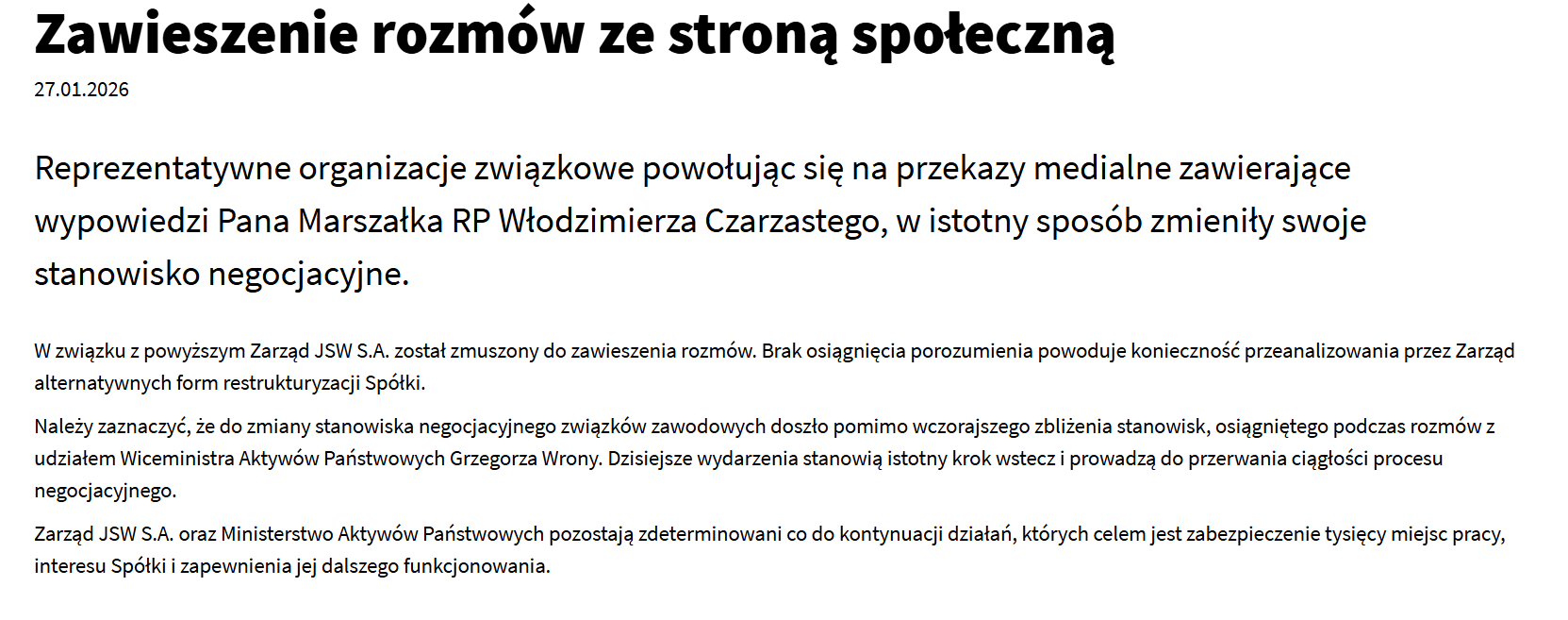 Biuro prasowe JSW podkreśliło, że brak osiągnięcia porozumienia zmusza zarząd do analizowania alternatywnych form restrukturyzacji spółki. Równocześnie zapewniono, że spółka i Ministerstwo Aktywów Państwowych pozostają zdeterminowane w działaniach mających zabezpieczyć miejsca pracy i dalsze funkcjonowanie JSW.