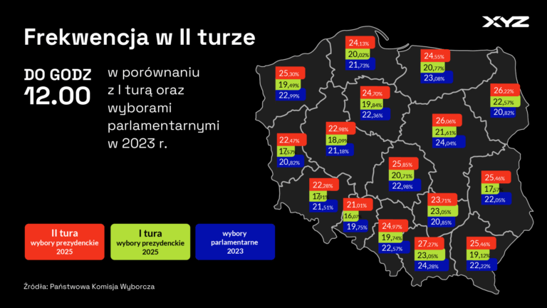 Porównanie poziomu frekwencji do godz. 12 w I i II turze wyborów prezydenckich oraz w wyborach parlamentarnych w 2023 r. przedstawiamy na poniższej infografice.