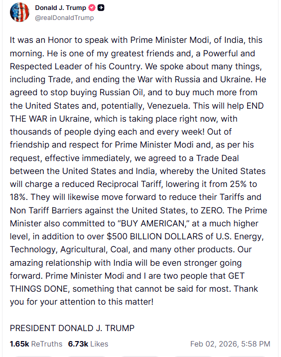 Podczas rozmowy Trump i Modi omówili kwestie handlu, zakupu surowców oraz zakończenia wojny w Ukrainie. Prezydent USA poinformował, że premier Indii zgodził się wstrzymać import rosyjskiej ropy i zwiększyć zakupy surowców oraz technologii od Stanów Zjednoczonych, a także potencjalnie od Wenezueli.