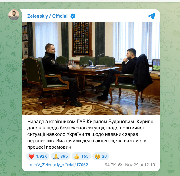 Według informacji Bloomberga Umerow i Kysłyca udali się do USA, by spotkać się z wysłannikiem prezydenta Donalda Trumpa ds. Rosji, Steve’em Witkoffem. W mediach pojawiły się również doniesienia o wylocie Budanowa, jednak źródła ukraińskiego wywiadu wojskowego zapewniły, że szef HUR pozostał w Kijowie.