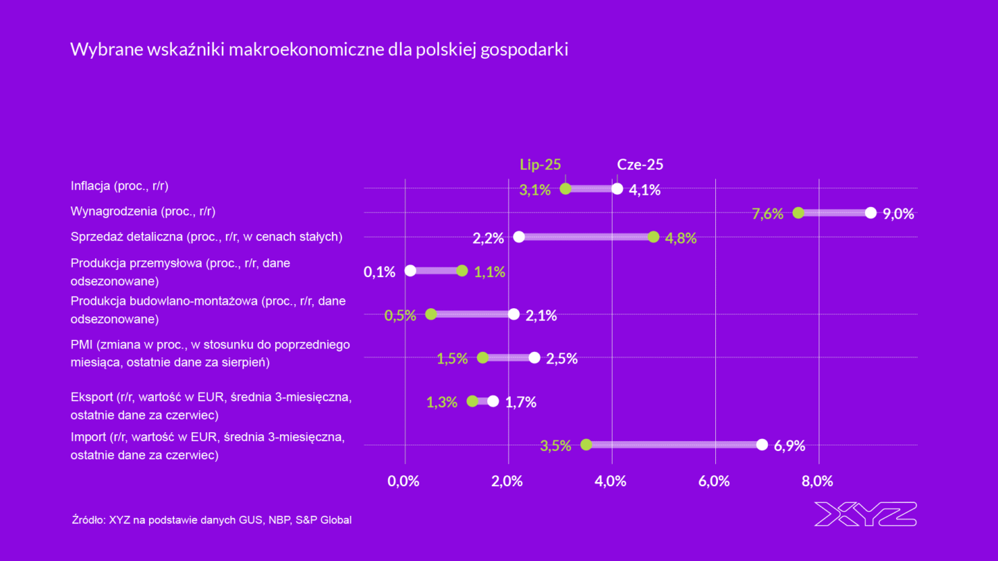 1. Głównym motorem wzrostu PKB w Polsce pozostaje konsumpcja. Sprzedaż detaliczna w cenach stałych wzrosła w lipcu o 4,8 proc. r/r. Dane z zakresu produkcji przemysłowej i budowlano-montażowej są bardziej nierówne, ale pozytywnym sygnałem są dane o eksporcie. Procesy dezinflacyjne trwają: w lipcu wyhamowała zarówno inflacja, jak i wynagrodzenia w sektorze przedsiębiorstw.