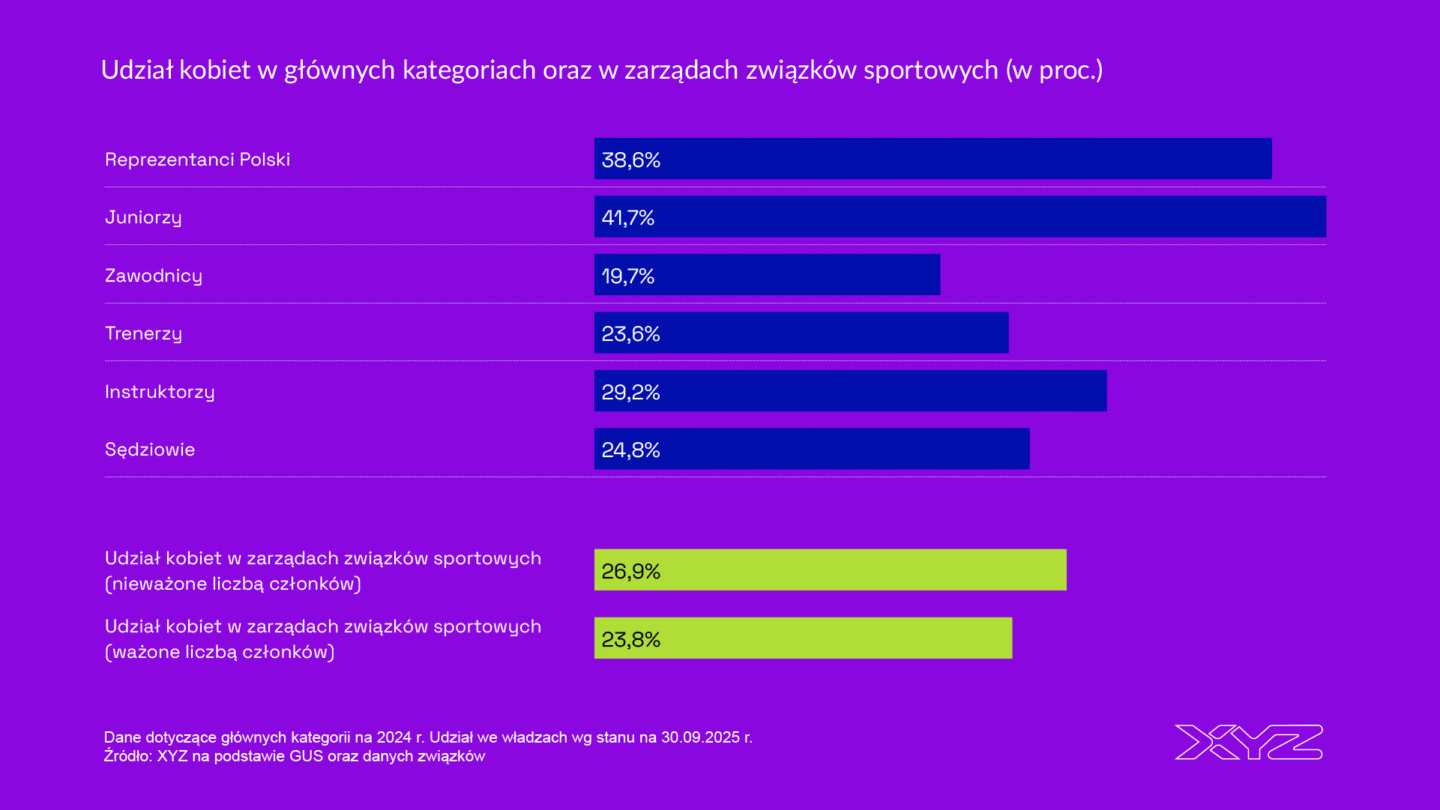 Reprezentacja kobiet we władzach związków sportowych jest jednak proporcjonalna, kiedy za punkt odniesienia przyjmiemy odsetek zawodników i trenerów. Według danych z publikacji GUS „Kultura fizyczna w Polsce w 2024 r.”, udział kobiet w całkowitej liczbie zawodników należących do związków sportowych wyniósł 19,7 proc. Nieco wyższy był udział wśród trenerów (23,6 proc.) i sędziów (24,8 proc.), a wyraźnie wyższy wśród instruktorów (29,2 proc.).
