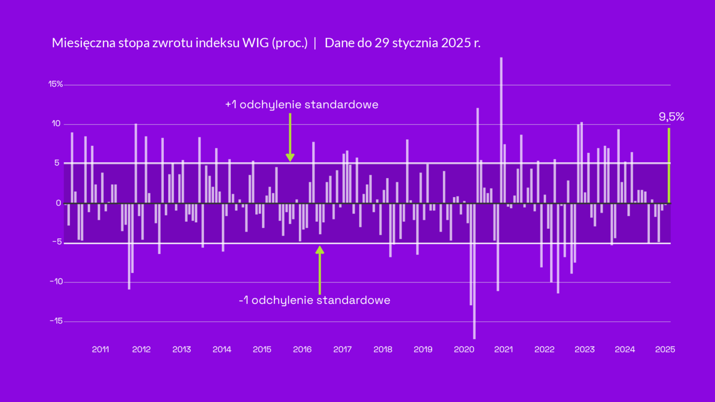 Ponadstandardowy optymizm widać również wśród inwestorów na warszawskiej giełdzie. Wzrost indeksu WIG wyraźnie przekracza wartość odchylenia standardowego z ostatnich 15 lat, co oznacza, że zmiana jest równa niemal dwukrotnej standardowej zmienność tego indeksu. Styczeń okazał się jednym z najlepszych miesięcy w ostatnich latach – w ciągu miesiąca WIG nadrobił niemal pół roku wcześniejszych spadków.