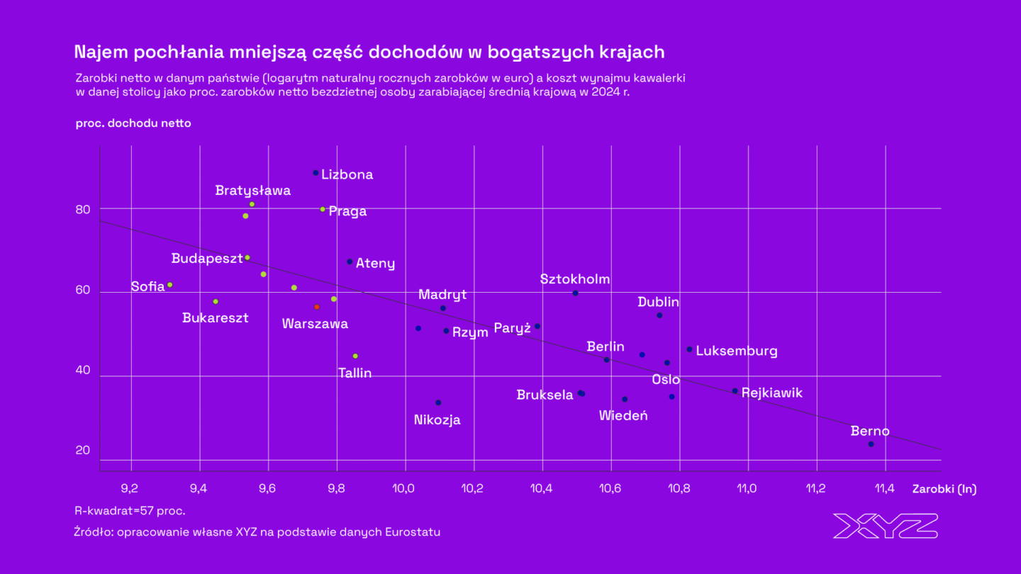 Wniosek jest dość prosty: w biedniejszych krajach najem pochłania większą część wynagrodzenia, a w bogatszych – wyraźnie mniejszą.