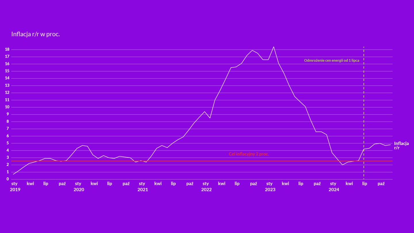 Kluczowym czynnikiem, który wpłynął się na kształtowanie się inflacji w drugiej połowie roku było częściowe odmrożenie cen energii od lipca 2024 r. Spowodowało to wzrost dynamiki inflacji w ujęciu r/r, która kształtowała się pomiędzy lipcem a grudniem w przedziale od 4,2 proc. do 5,0 proc.