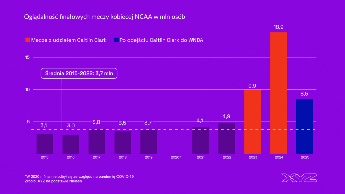 Co istotniejsze, efekt wzrostu popularności utrzymał się po odejściu Caitlin Clark do WNBA w sezonie 2024/2025. Finałowy mecz NCAA w 2025 r. przyciągnął 8,5 mln odbiorców, czyli ponad dwa razy więcej niż wynosiła średnia w ubiegłych latach.