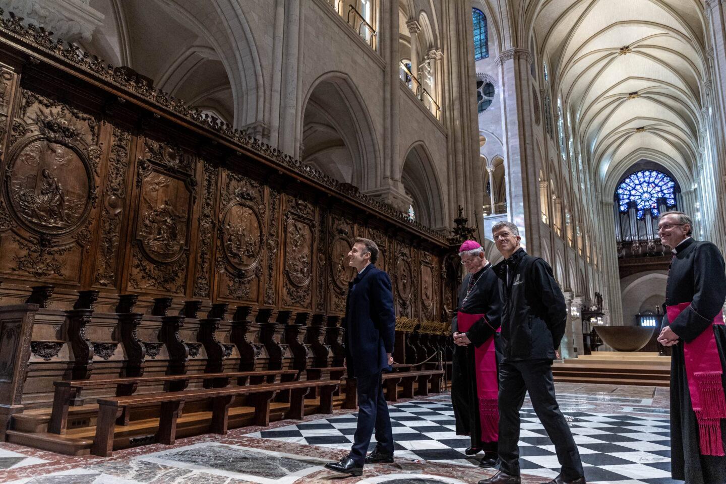 Uroczystości świeckie ponownego otwarcia katedry i przemówienie prezydenta Macrona odbędą się w sobotę 7 grudnia na jej dziedzińcu, gdzie znajduje się ogromny przezroczysty namiot. Dlaczego nie w środku? Prezydent Republiki podkreśla w ten sposób rozdział państwa od kościoła. 8 grudnia odbędzie się w katedrze msza święta.