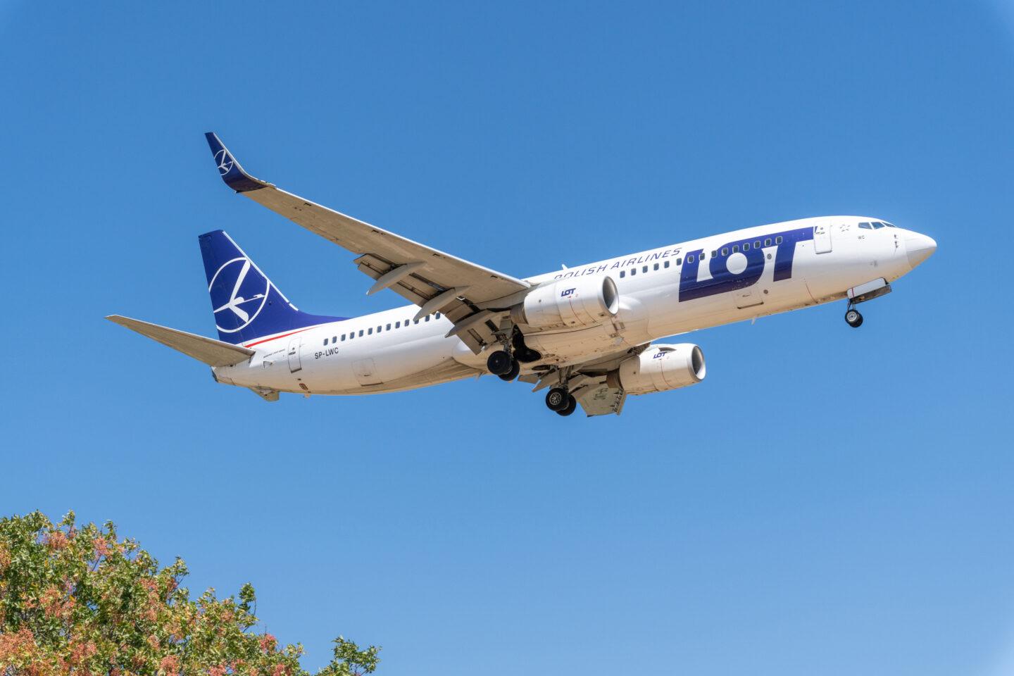 Samolot wąskokadłubowy PLL LOT w powietrzu na tle niebieskiego nieba.