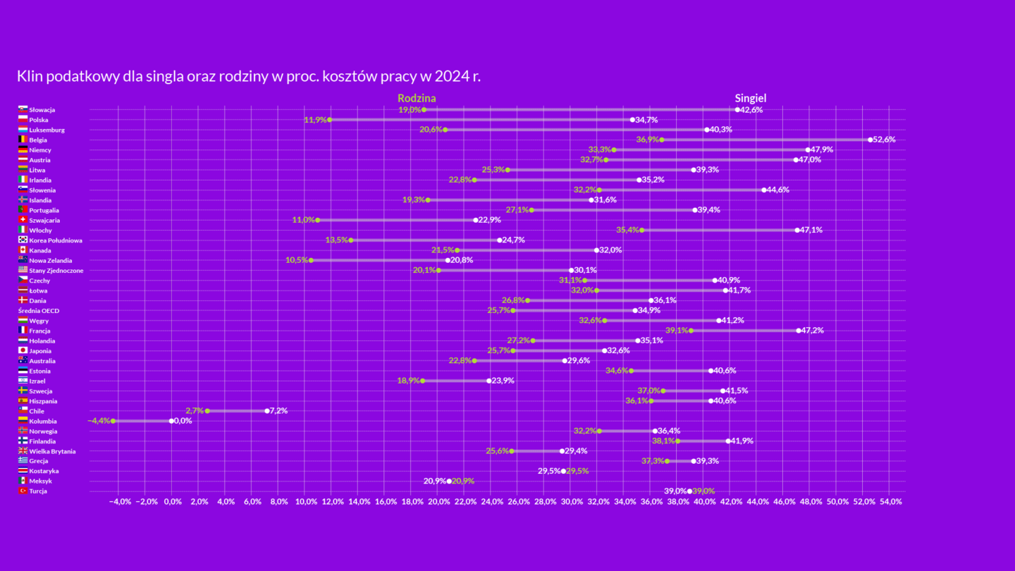 2. Podstawowym wskaźnikiem w zestawieniach klina podatkowego jest klin dla singla osiągającego zarobki w wysokości 100 proc. przeciętnego wynagrodzenia. W Polsce w 2024 r. wyniósł on 34,7 proc. i był o 0,2 pkt proc. niższy od średniej dla krajów OECD. Najwyższy klin występował w krajach Europy kontynentalnej (Belgia, Niemcy, Francja, Włochy) i zawierał się w przedziale 47-52 proc. Znacznie niższe obciążenia odnotowano w krajach anglosaskich, a najniższe – w krajach Ameryki Łacińskiej.