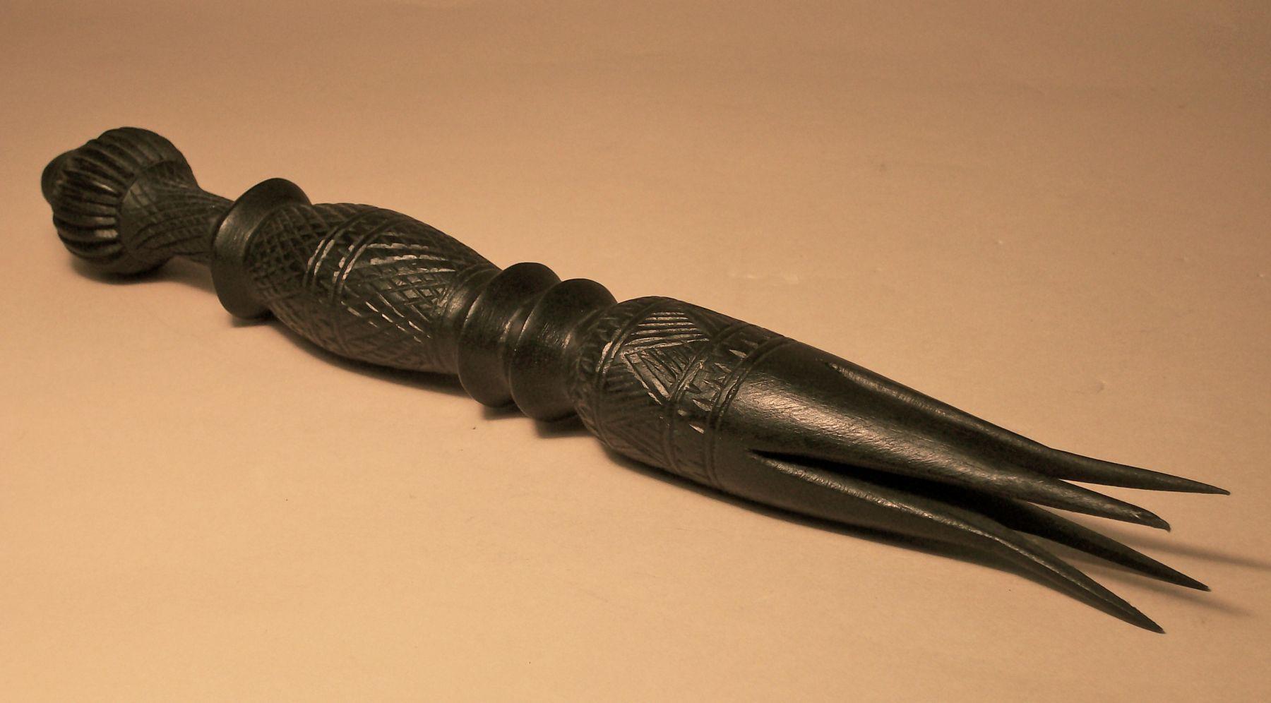 Jak twierdzą badacze, europejska fascynacja kulturową odmiennością Fidżi kwitła już w czasach wiktoriańskich. Wiele jednak wskazuje, że obecnie rzemiosło tych pacyficznych wysp wciąż nabywane bywa w kontekście wyszukanych gabinetowych kuriozów, a nie dziedzictwa regionu. Kipiące grozą opowieści o egzotycznych ludożercach poruszać mogą niejedną schorowaną strunę kolekcjonerskiego rynku. Trudno w końcu inaczej nazwać tlący się po cichu, brudny sentyment dla kolonializmu. Niezdrowy głód reliktów odległego, wręcz epickiego barbarzyństwa. Gdyby na notę katalogową takiego widelca natrafił przypadkiem Wojciech Smarzowski, mierzący się w swoim kinie z najciemniejszymi stronami ludzkiej natury, byłby to może dla niego kolejny temat…