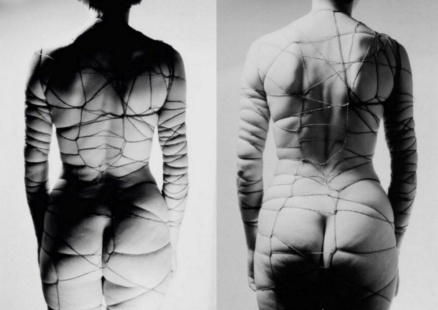 Choć trudno przejść z kontekstu autentycznej tragedii do wątków przemocowej frywolności, dokładnie tego wymaga nasz przegląd. Sztuka zderza przecież odbiorców z bólem wyrażonym poprzez mnóstwo formuł. Jedną z nich rozwinął w latach 50. XX wieku Zdzisław Beksiński, artysta słynący później z precyzyjnie oddanej, kunsztownej wręcz upiorności. Operując malarskim warsztatem dawnych mistrzów, portretował wynędzniałe kościste zjawy, najczęściej samotnie snujące się w skamieniałym krajobrazie. Nie wszyscy wiedzą natomiast, że w połowie minionego wieku autor ten sięgnął po wątek znacznie bliższy codziennej intymności. Wykonał serię fotografii ukazujących nagie kobiece ciało – gładkość jego jasnej skóry, naturalność kształtów… Prace te dalekie były jednak od klasycznej konwencji salonowego aktu. „Gorsety sadysty” – bo takie nosiły tytuły – przedstawiały sylwetki ciasno spętane jutowymi sznurkami. Wpijająca się w ciało siatka rozczłonkowywała je ciemnymi liniami na miękkie kawałki. Co szczególnie interesujące, Beksiński nie był w tej intensywnej nastrojowości osamotniony.