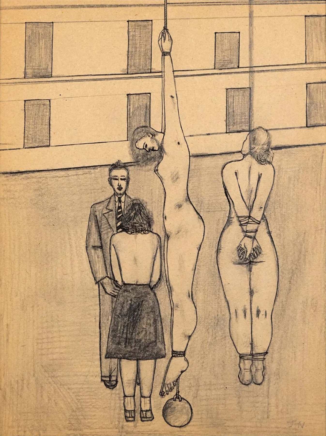 Na połowę ubiegłego wieku przypadł również osobliwy cykl prac Jerzego Nowosielskiego, malarza przeważnie sakralizującego kobiecą fizyczność. W dziełach z tego okresu Nowosielski uchwycił jednak bardzo zbliżony rodzaj napięcia przepływającego w dominacyjnych relacjach. Kobiety poddawane wymyślnym egzekucjom stoją nago lub w granatowych spódnicach. Nieubłagani funkcjonariusze natomiast – zawsze płci męskiej – przypatrują się im z bliska w formalnych garniturach i koszulach zapiętych po samą szyję. Erotyka rodem z mało ambitnego kina? Niekoniecznie, jeśli uwzględnimy obyczajowość epoki. W czasach, na które datowane są artystyczne fantazje obu autorów, brawurą byłaby spódnica odsłaniająca kolana. Jakiej wolności umysłowej musiał wobec tego wymagać akt, na którym modelka – ubrana jedynie w siatkę jak do parzonej szynki – wygląda jak popękana porcelanowa waza…?
