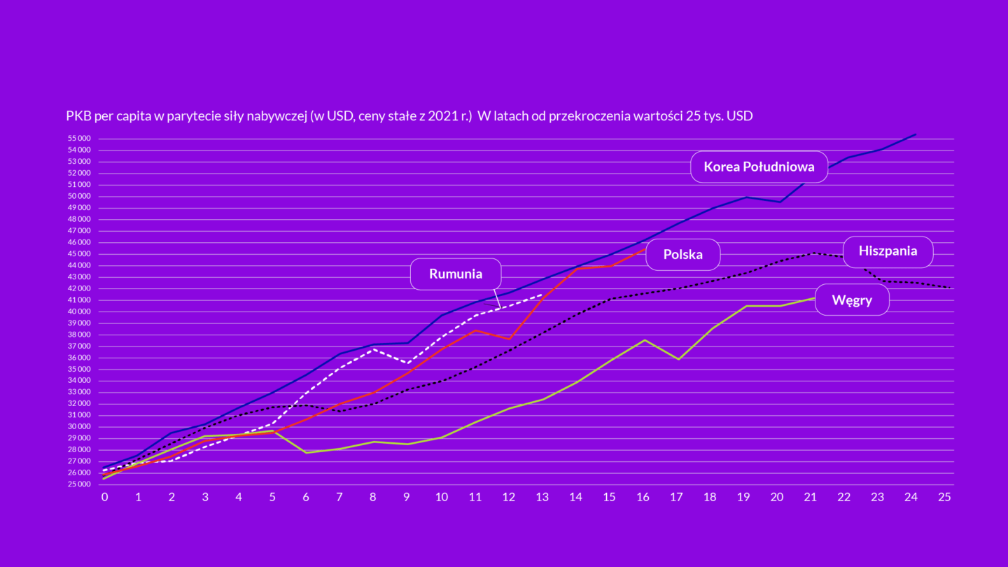 Polska podąża ścieżką wzrostu podobną do Korei Południowej. Zarówno nam, jak i Korei, przejście od 25 tys. do 45 tys. dolarów PKB per capita w parytecie siły nabywczej zajęło 16 lat. Korea Południowa kontynuowała szybki rozwój – w 2023 r. jej dochód na osobę wyniósł około 55 tys. dolarów.