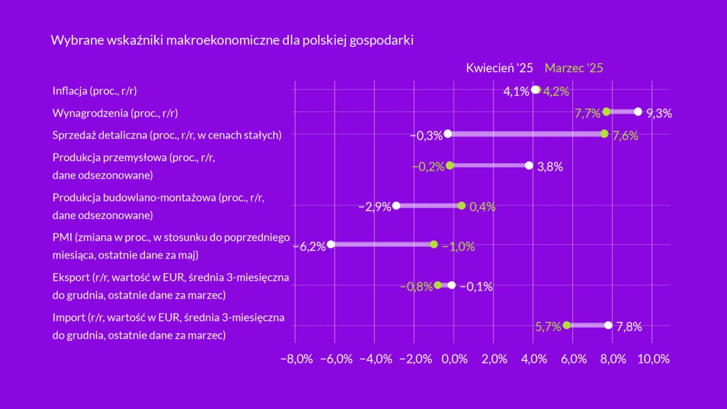- Gospodarka wysyła mieszane sygnały. Polska gospodarka rośnie w umiarkowanym tempie (PKB +3,2% r/r), napędzana głównie konsumpcją, ale dane są niespójne: mocna sprzedaż detaliczna kontrastuje ze słabym przemysłem i PMI poniżej 50 pkt. Inflacja spadła szybciej niż oczekiwano, co pozwoliło RPP w maju na cięcie stóp, choć niepewność co do dalszych trendów rośnie.