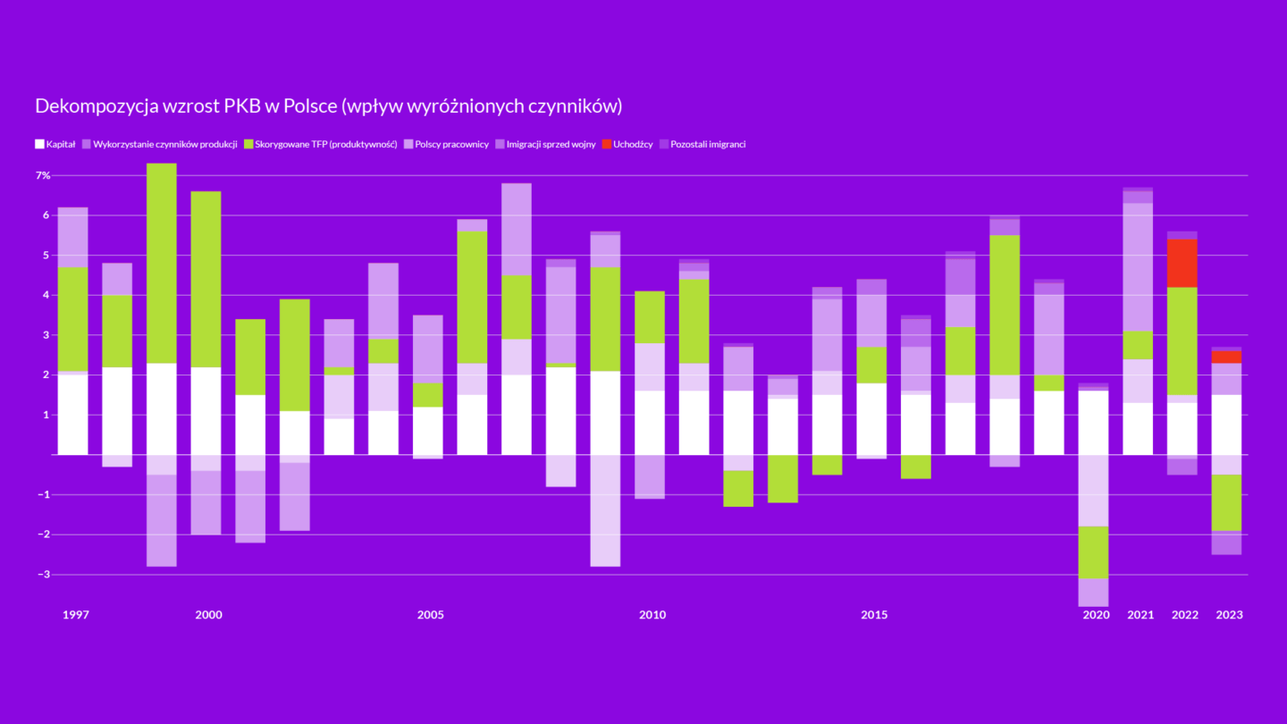 W latach 2021–2023 całkowity efektywny wkład pracy w gospodarce rósł średnio o 1,4 proc. rocznie. Z tego aż 1,3 punktu procentowego (czyli 93 proc. całego wzrostu) pochodziło od uchodźców z Ukrainy. Dodatkowe 0,3 punkty procentowe dodała migracja z innych krajów, natomiast powroty wcześniejszych ukraińskich migrantów do ojczyzny obniżyły ten wskaźnik o 0,8 punktu procentowego, niwelując znaczną część napływu.