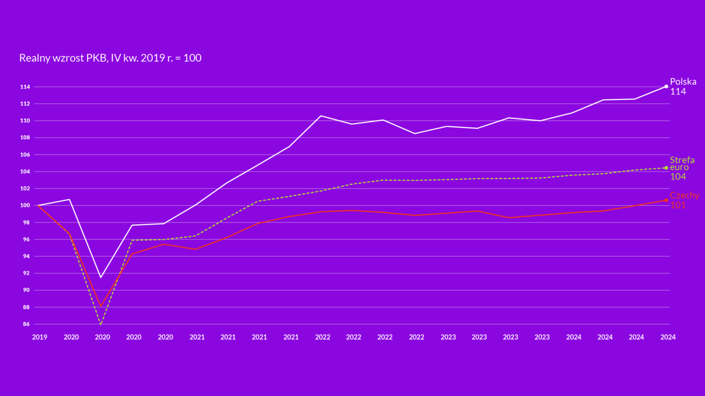 Obie gospodarki są do siebie podobne i funkcjonowały w podobnym środowisku makroekonomicznym. W 2020 r. pandemia spowodowała spadek PKB. W Czechach był on głębszy niż w Polsce. Kluczowa różnica wynikała jednak z tempa odbudowy. Polska gospodarka wystrzeliła, podczas gdy czeska odbudowała się nieco, a potem utkwiła w bezruchu na ponad dwa lata.