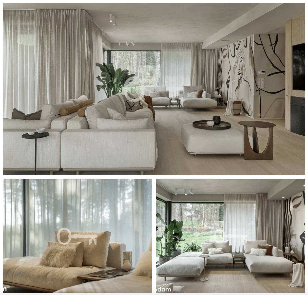 Sam apartament ma dobrze przemyślany rozkład – jest salon z dużymi przeszkleniami i widokiem na las sosnowy i Zatokę, kuchnia połączona z jadalnią, główna sypialnia z prywatną łazienką i garderobą, dwie dodatkowe sypialnie, gabinet, garderoba, trzy łazienki, hol i taras z wyjściem do ogrodu. Jest też pomieszczenie gospodarcze.