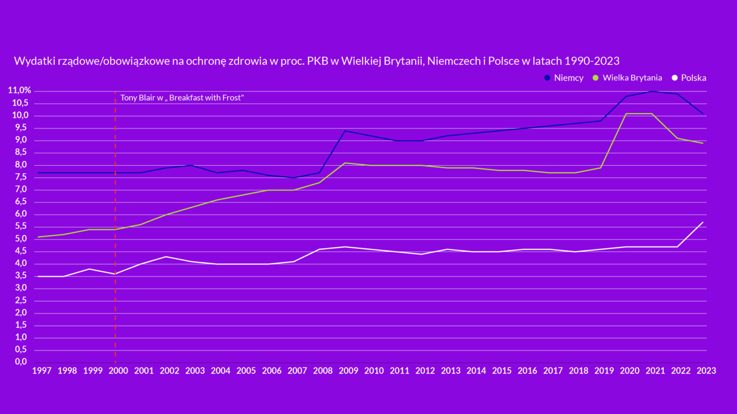 2. W 2000 r. premier Tony Blair ogłosił, że Wielka Brytania w ciągu pięciu lat dogoni pod względem wydatków zdrowotnych średnią dla państw UE. Ocenia się, że był to najbardziej transformacyjny moment w historii brytyjskiej NHS. Zgodnie z danymi OECD w ciągu dekady publiczne finansowanie ochrony zdrowia zwiększyło się z 5,4 do 8,1 proc. PKB. Przyniosło to znaczną poprawę jakości usług. Czas oczekiwania na planowane zabiegi skrócił się  z 18 miesięcy w 2000 r. do ok. 18 tygodni pod koniec drugiej dekady XXI wieku. Odsetek pacjentów oczekujących na test diagnostyczny powyżej sześciu tygodni zmniejszył się z 50 do poniżej 5 proc.