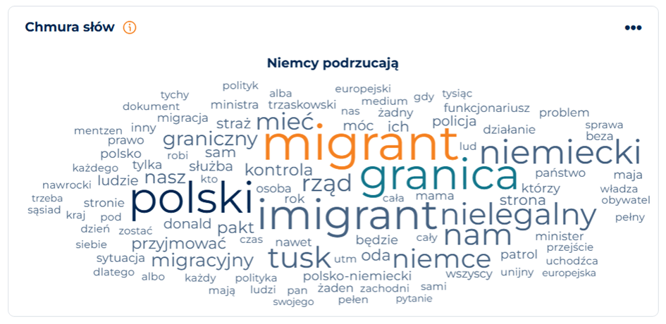 Chmura słów, czyli zestawienie wyrazów, które najczęściej łączono z frazą „Niemcy podrzucają” opublikowanych w mediach społecznościowych między 1 stycznia i 29 lipca, pokazuje, że debata o podrzucanych migrantach uderzała w premiera Donalda Tuska i Rafała Trzaskowskiego, który był kandydatem KO w wyborach prezydenckich.