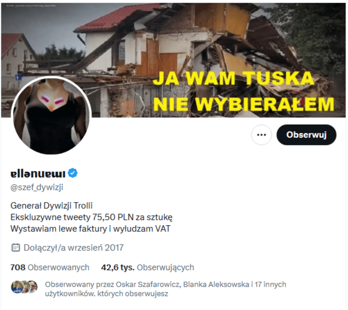 Zidentyfikowaliśmy także konta anonimowych internautów, jak np. @szef_dywizji. W jego opisie czytamy, że to „Generał Dywizji Trolli”. „Ja wam Tuska nie wybierałem” – informuje odwiedzających jego profil na X-ie.
