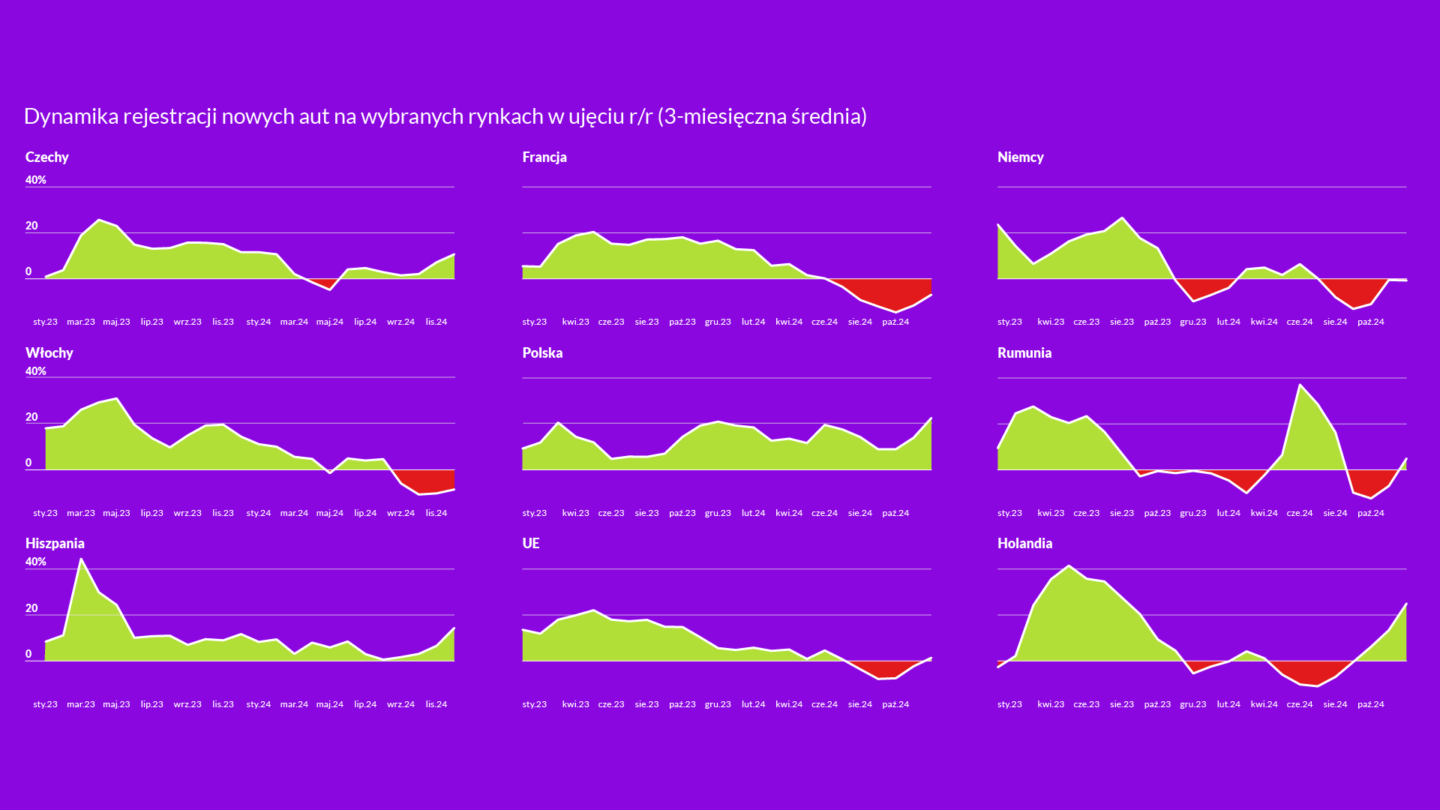 Silny wzrost popytu jest widoczny w Polsce, gdzie sprzedaż w grudniu była wyższa o 22,6 proc. rok do roku. Wysokie wzrosty miały też miejsce w Holandii (25 proc.), Hiszpanii (14,4 proc.) oraz w Czechach (10,7 proc.). Poprawiła się również sytuacja w Rumunii.