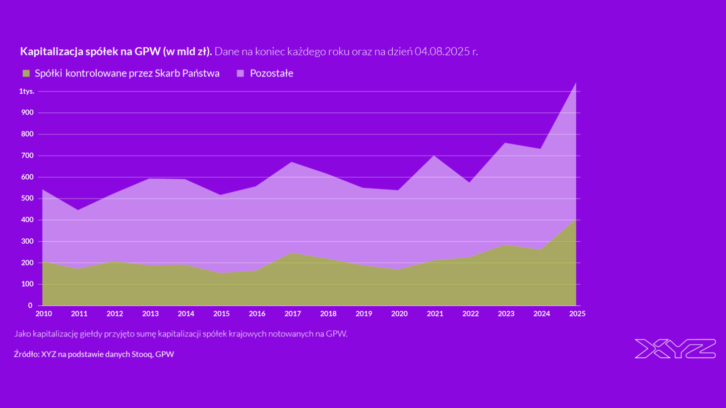 Na polskiej giełdzie silną pozycję mają spółki państwowe. Ich kapitalizacja przekracza 400 mld zł, stanowiąc 39 proc. wszystkich notowanych spółek. Chociaż wzrosty tych firm napędzają obecną hossę, ich dominacja jest symptomem problemów giełdy. Brakuje na niej dużych, prywatnych spółek, a rynek kapitałowy nie odzwierciedla dynamicznego wzrostu polskiej gospodarki.