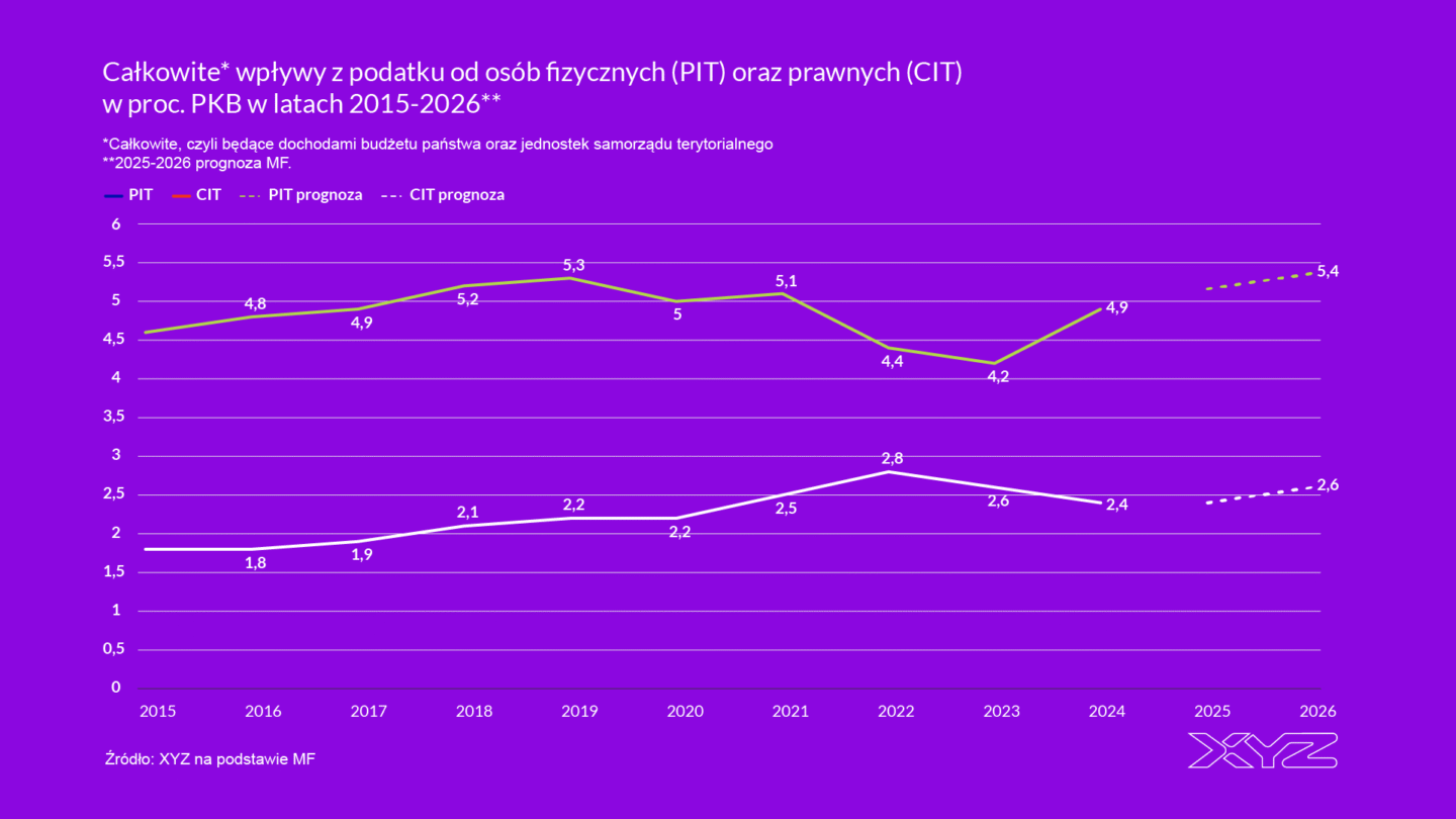 Mrożenie progów podatkowych sprawia, że w 2026 r. udział PIT w PKB będzie najwyższy od reformy emerytalnej z 1998 r. Bez zmian systemowych trudno będzie dobić do nadzwyczajnie wysokiego poziomu CIT z 2022 r. Mrożenie świadczeń nie rekompensuje wzrostu wydatków obronnych, na ochronę zdrowia oraz kosztów obsługi długu.