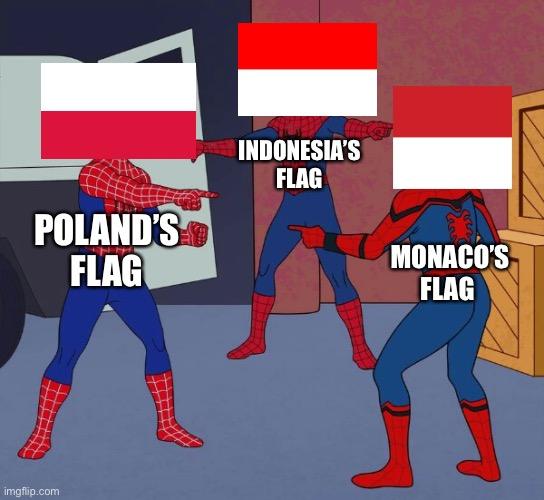 Poland’s flag shares its simplicity with Indonesia’s and Monaco's sparking endless memes like this Spider-Man classic where Poland points accusingly at the copycats – because who wouldn’t claim dibs on the chicest two-tone look?