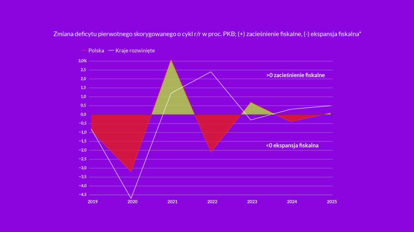 - W porównaniu z grupą krajów rozwiniętych mieliśmy w 2020 r. nieco mniejszy (o 1,5 pp. PKB) impuls fiskalny (ekspansję), a także znacznie większe zacieśnienie w 2021 r. (o niemal 2 pp.). Od 2022 r. nasza polityka fiskalna „rozjechała się” względem prowadzonej w krajach rozwiniętych – gdy te kraje się zacieśniały (2022 i 2024 r.), Polska się rozluźniała. Natomiast w 2023 r. odwrotnie – mieliśmy konsolidację fiskalną, podczas gdy inne kraje miały nieznaczną ekspansję.