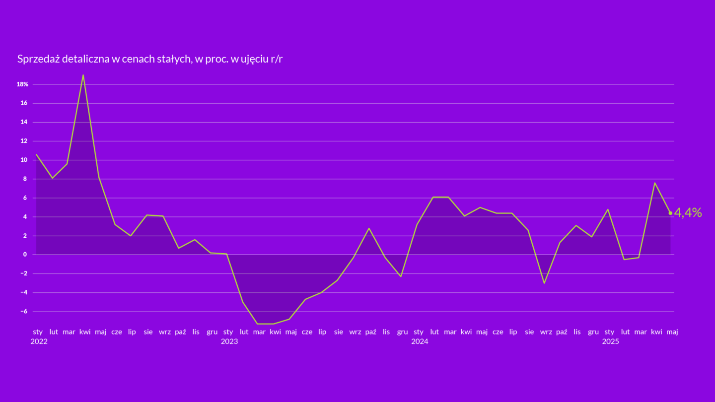 Zacznijmy od sprzedaży detalicznej, która w cenach stałych wzrosła o 4,4 proc. r/r. To drugi z rzędu wyraźny wzrost w tej kategorii – po 7,6-proc. wzroście w kwietniu, choć wówczas na wynik silnie wpłynęły czynniki sezonowe związane z Wielkanocą. Obecne dane sugerują, że konsumenci zaczynają trwale zwiększać swoje wydatki.