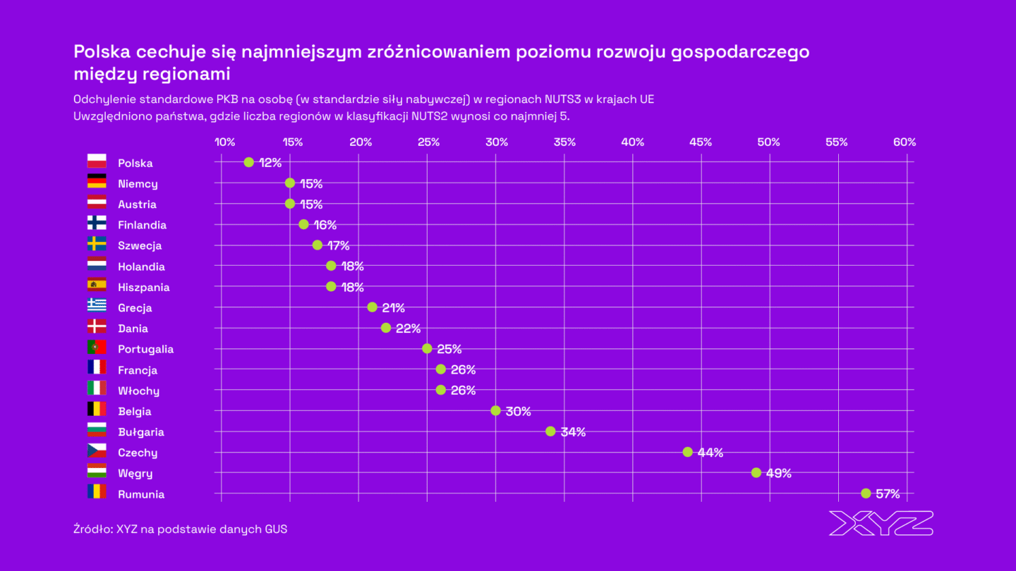 Polska wyróżnia się jako kraj o najmniejszych różnicach regionalnych spośród wszystkich średnich i dużych gospodarek Unii Europejskiej. W analizie uwzględniono państwa posiadające co najmniej pięć regionów NUTS 2.