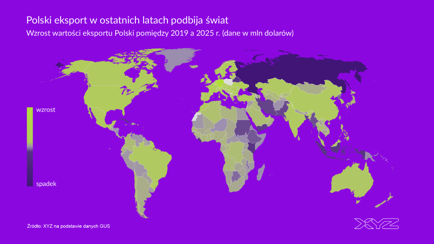 Geograficzny wzrost tego eksportu jest dosyć zdywersyfikowany, co dobrze widać na mapie. Najważniejszą rolę odgrywają rynki europejskie. Według danych GUS, od 2019 do 2025 r. wartość polskiego eksportu wzrosła o 144 mld dol. Za 1/4 tej zmiany odpowiadał wzrost wartości eksportu do Niemiec, który urósł o 37 mld. Niedawno informowaliśmy, że Polska w 2026 r. może stać się większym partnerem handlowym dla tego państwa niż Francja.
