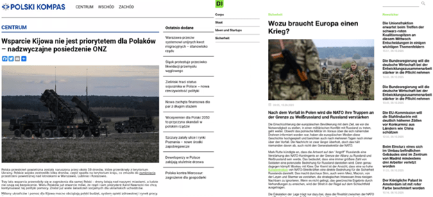 Kampania Doppelgänger wykorzystała swoje fałszywe marki medialne do ataków w różnych językach. "Polski Kompas" opublikował materiał, twierdząc, że Polacy nie popierają polityki rządu wobec Ukrainy, która obciąża budżet i zagraża bezpieczeństwu obywateli. Z kolei niemiecki "Deutsche Intelligenz" przekonywał, że europejska reakcja na incydent jest przesadzona. Stanowi część kampanii zastraszania, która wciąga Europejczyków w konflikt z Rosją.