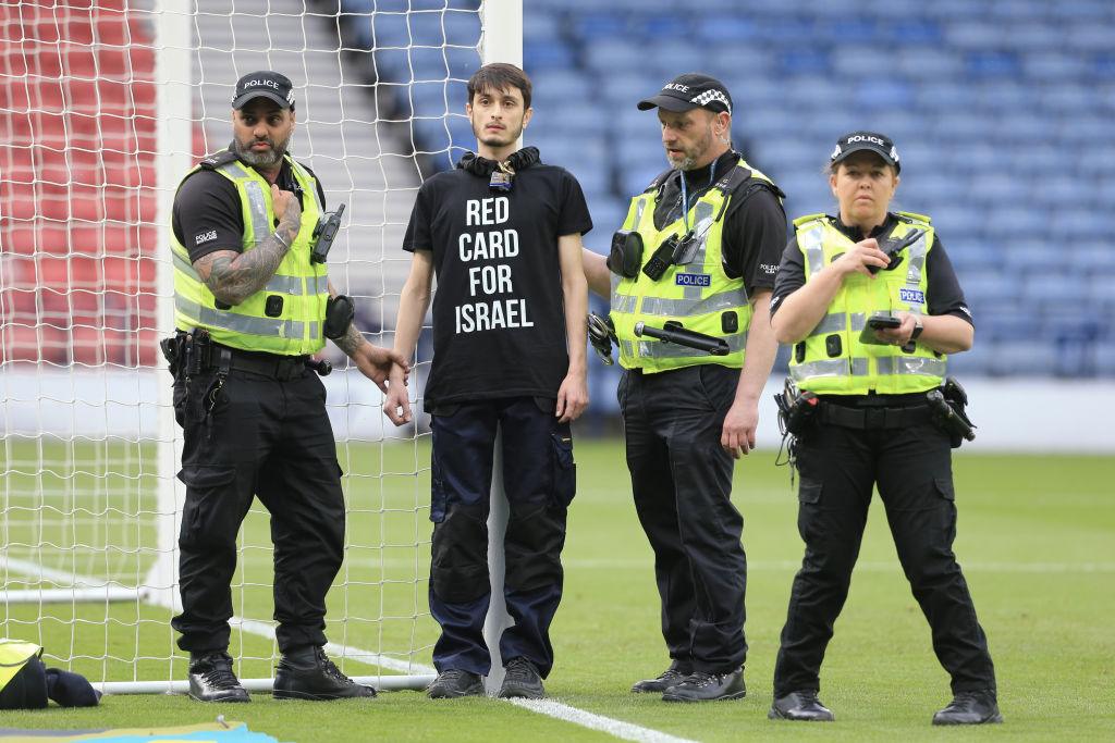 W maju 2024 r. przed piłkarskim meczem Szkotek z Izraelkami, do jednej z bramek przykuł się łańcuchem mężczyzna w koszulce z napisem "Czerwona kartka dla Izraela".
