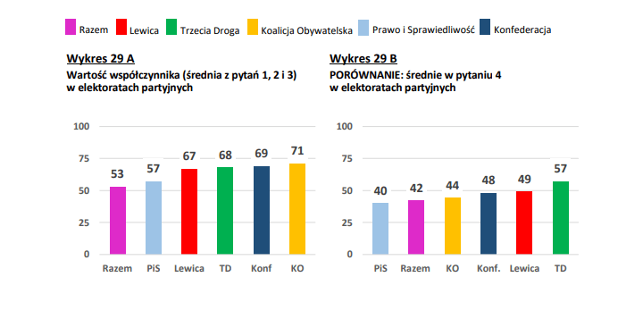 Jeśli wziąć pod uwagę preferencje partyjne, ogólnie najbardziej przeciwni prywatyzacji są wyborcy Razem i PiS, a jej największymi zwolennikami – wyborcy KO i Konfederacji, za którymi jednak nie daleko znajdują się także m.in. wyborcy Lewicy. Jeśli jednak zadać pytanie o konkretną prywatyzację Orlenu czy KGHM, wyborcy KO są zdecydowanie jej przeciwni, a zdecydowanie najbardziej pro-prywatyzacyjni okazują się być wyborcy Trzeciej Drogi.