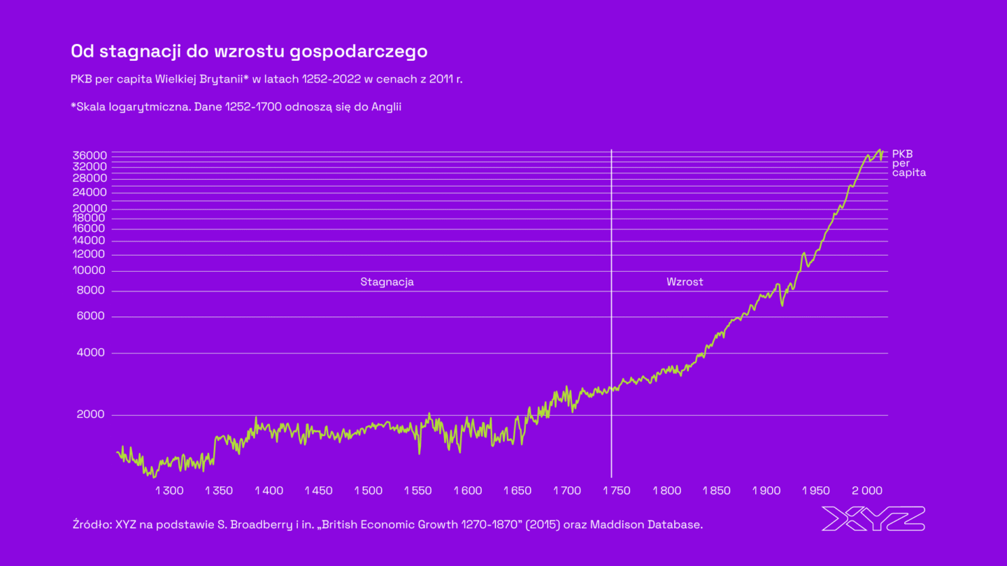 Dramatyczna zmiana przyszła dopiero wraz z przejściem do epoki nowoczesnego wzrostu po rewolucji przemysłowej. Gospodarka zaczęła się rozwijać w tempie 1,5-2 proc. rocznie. Zmiana była jakościowa i miała wpływ na wszystkie dziedziny życia: od zdrowia (długość życia), po edukację czy materialny dobrobyt (konsumpcję).
