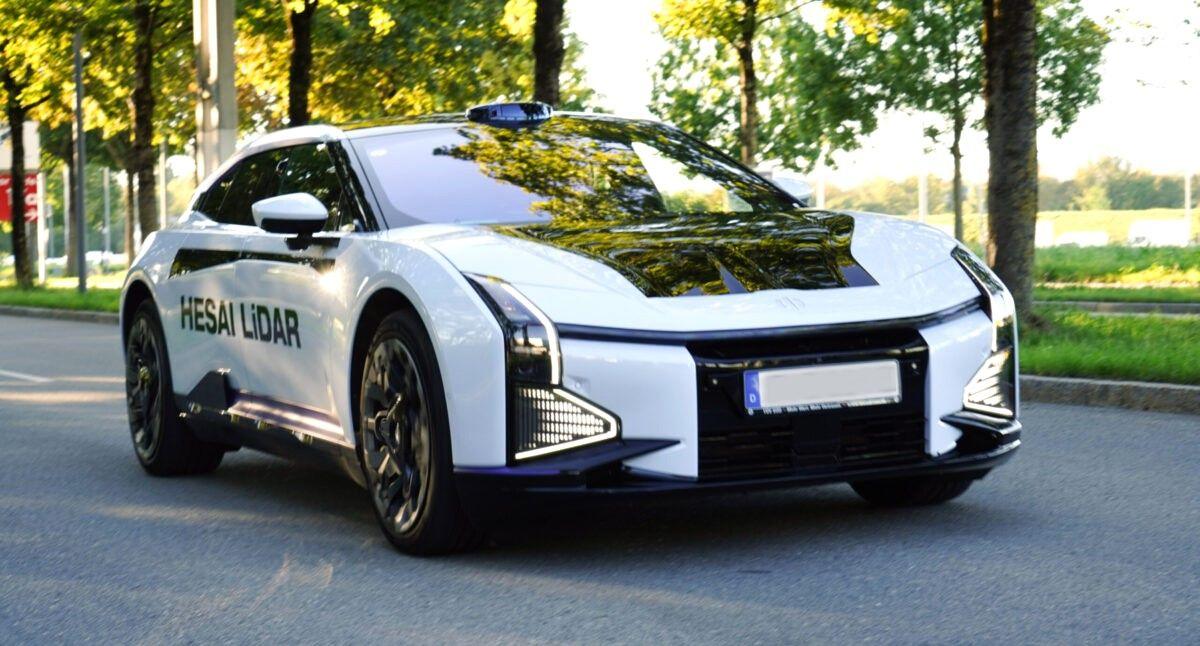 Kamery są pasywne, a LiDAR jest aktywny – wysyła impulsy, które odbijają się od obiektów. Działa podobnie jak radar z tym, że wykorzystuje laser zamiast fal radiowych. Na zdjęciu auto z wbudowanym w dach LiDAR-em firmy Hesai. Fot: Hesai