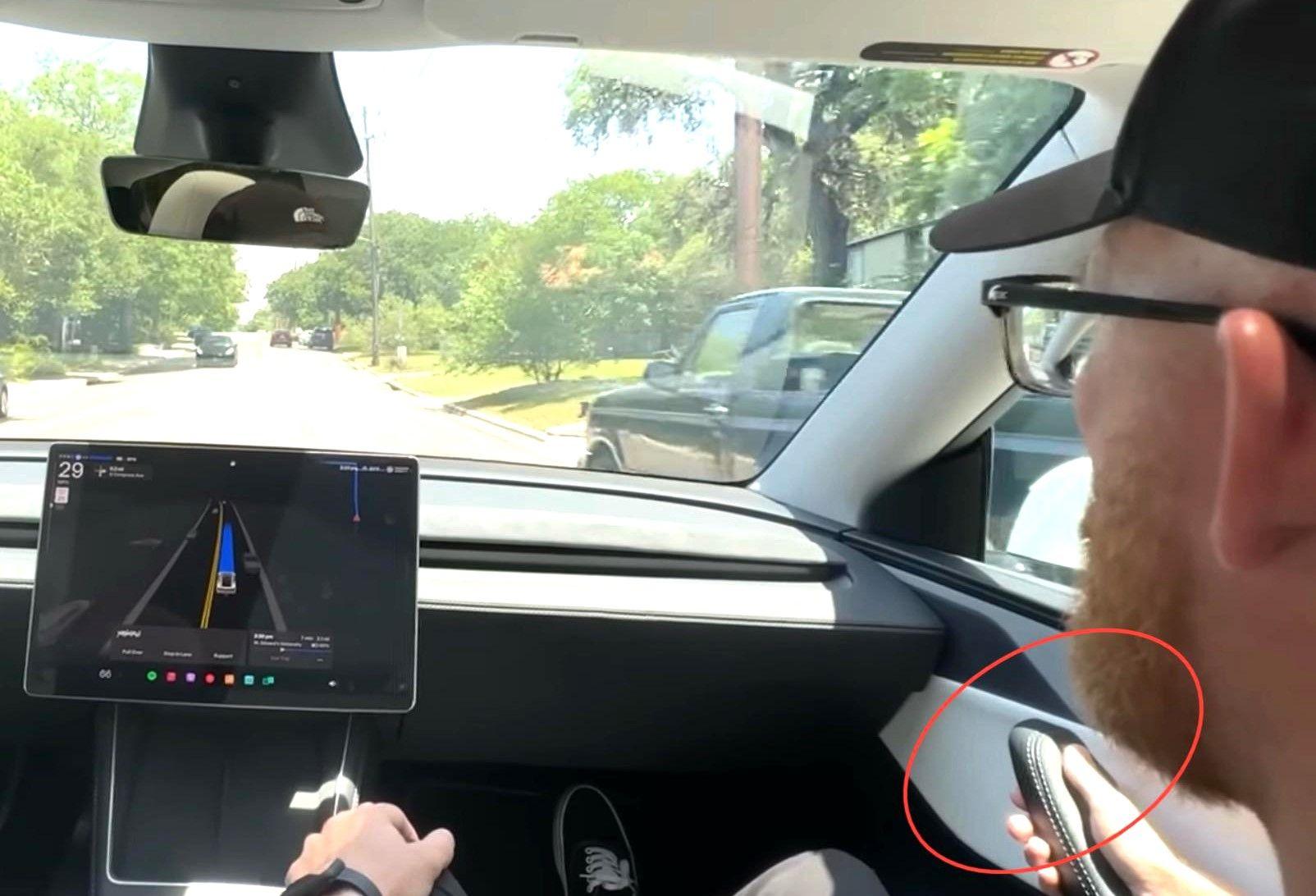 Nie dla dzieci. Kiedy Tesla usunie ludzkie „monitory” z aut? Ponoć jeszcze w czerwcu. Co nie znaczy, że pojazdy będą zostawione same sobie. Już teraz pieczę nad nimi sprawują dyżurni teleoperatorzy. Pasażer nie musi interweniować, ani nawet mieć prawa jazdy. Musi być za to pełnoletni. Na zdjęciu widać, jak „monitor” trzyma kciuk na przycisku otwierania drzwi przeprogramowanym tak, by pełnił rolę hamulca. Fot: TeslaLounge