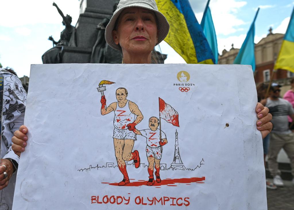 Kraków, protest przeciwko dopuszczeniu Rosji i Białorusi do startu w igrzyskach w Paryżu. Ukraina i wspierające ją kraje domagają się utrzymania izolacji przede wszystkim rosyjskich sportowców. Fot. Artur Widak/NurPhoto via Getty Images